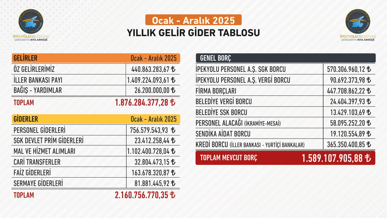“Şeffaf Belediyecilik anlayışımızla, Halkın katılımını sağlayacağız” sözümüze bağlı kalarak, Belediyemizin Ocak–Aralık 2025 dönemine ait bir yıllık mali durumunu kamuoyuyla paylaşıyoruz.