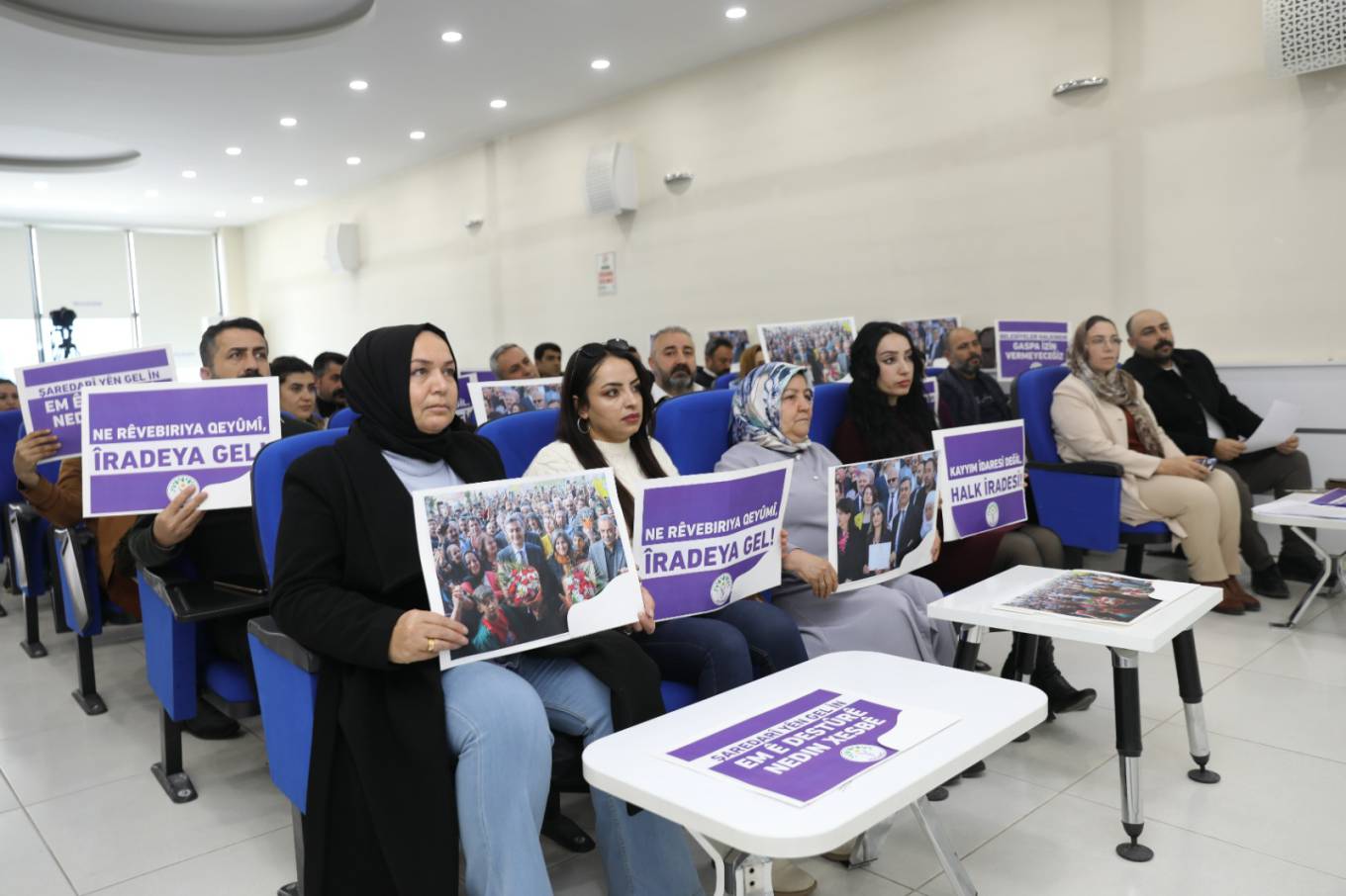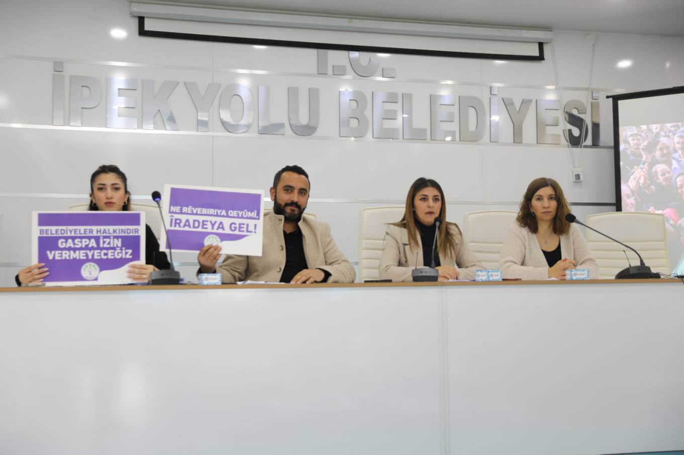 İpekyolu Belediyesi Mart ayı Olağan Meclis Toplantısının birinci gününde Van Büyükşehir Belediyesine atanan kayyım protestosuyla başladı. Toplantıya katılan DEM Partili Meclis üyeleri yerine kayyım atanan Belediye Eşbaşkanları Neslihan Şedal ve Abdullah Zeydan’ın fotoğraflarının yanı sıra “BELEDİYELER HALKINDIR, GASPA İZİN VERMEYECEĞİZ”, “NE REVEBERİYA ,QEYUMİ, İRADEYE GEL” Kürtçe Türkçe dövizlerde taşıdı.
