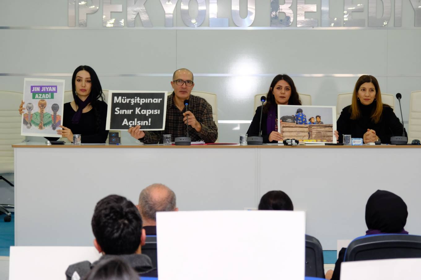 “Saldırıların başladığı 6 Ocak’tan bu yana olduğu gibi bundan sonra da Rojava’ya ses olmaya, Rojava halkının yanında olmaya devam edeceğiz. Bizler yerel yönetimler olarak her anlamda Rojava halkıyla dayanışma içerisinde olacağız. Başta kadınlar ve çocuklar açlığa, susuzluğa mahkûm ediliyor. Buna ses çıkarmak her vicdanlı bireyin sorumluluğudur. Çocuklar donarak yaşamını yitirdi. Savaşın bile bir ahlakı olur, maalesef onlarda o ahlak yok. Kadınlara işkence edildiğini gördük; bu saldırılar hiçbir yerde yok.