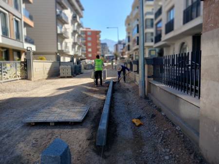 Cumhuriyet Mahallesi Işık Sokak’ta, Bitümlü Sıcak Karışım (BSK) asfalt serimi öncesi kaldırım bordür imalatı tamamlanmıştır.